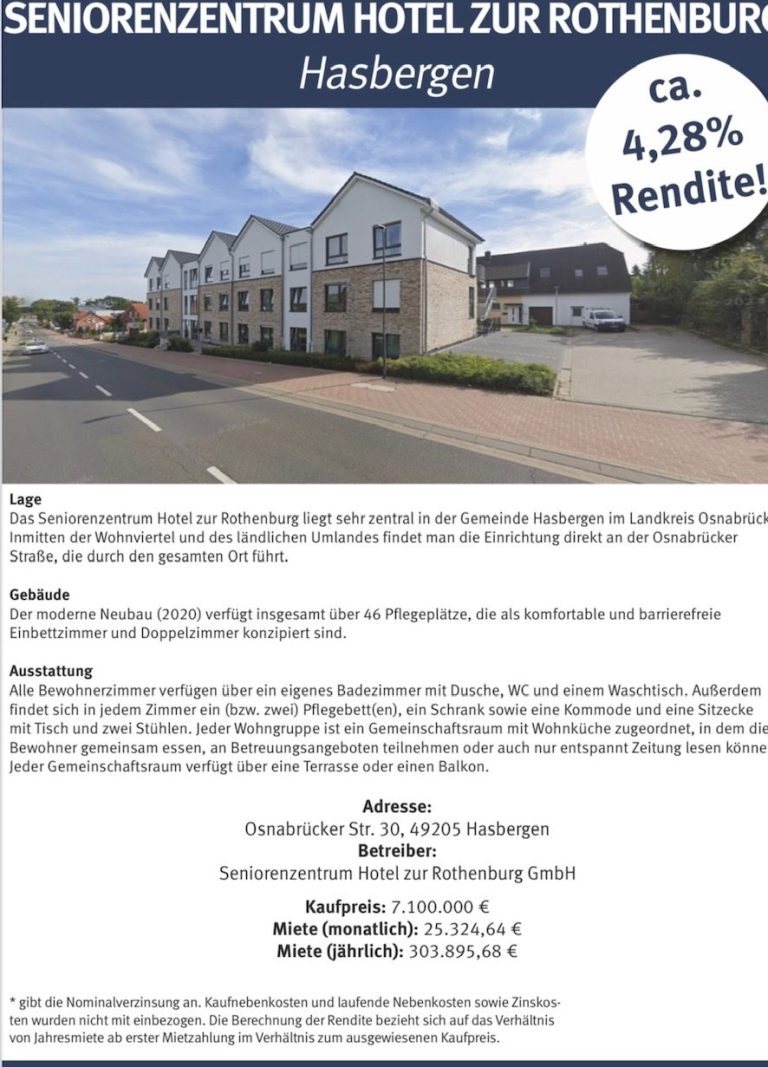Zum Verkauf steht das im Jahr 2020 neu errichtete Seniorenzentrum „Hotel zur Rothenburg“ am attraktiven Standort Hasbergen. Die Liegenschaft besticht durch ihre moderne Architektur, eine hochwertige Bauausführung und ein nachhaltiges Betriebskonzept, das sich harmonisch in die Umgebung einfügt.